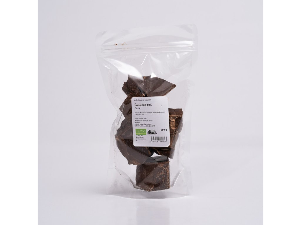 Single origin bio 60% čokoláda. Země původu kakaové hmoty a kakaového másla: Peru.