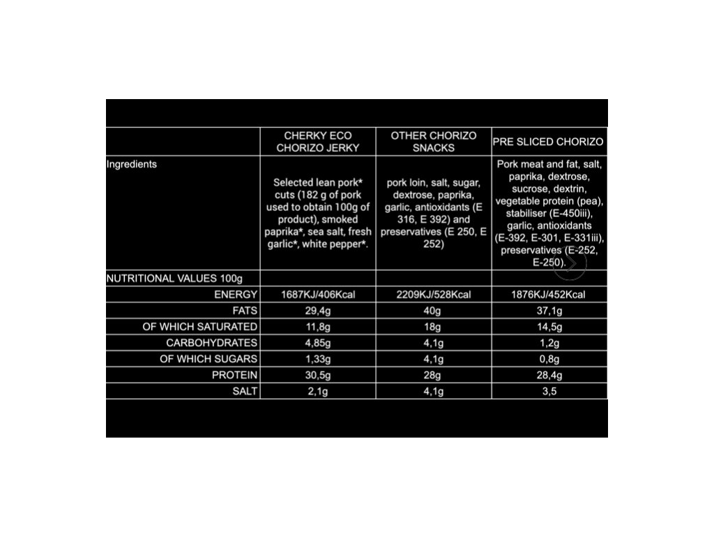 Naše ECO Pork Jerky je svačinka inspirovaná těmito dvěma rockstar produkty španělské gastronomie, ale vždy se řídí hodnotami jakéhokoli produktu Cherky: čisté suroviny nejvyšší kvality, chuti a výživy.