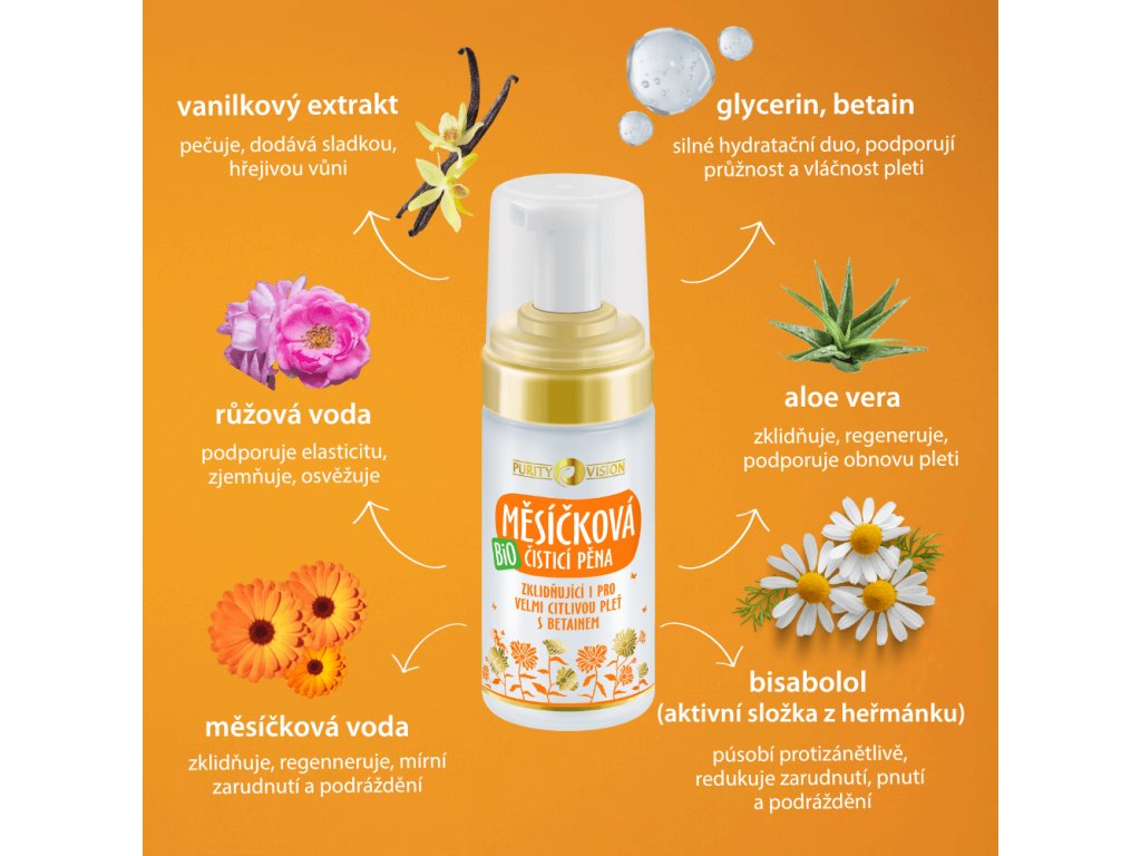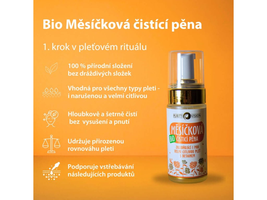 Jemná čisticí pěna bez pocitu vysušení. Bio Měsíčková čisticí pěna byla vytvořena s maximálním důrazem na šetrnost, vhodná i pro velmi citlivou pleť.