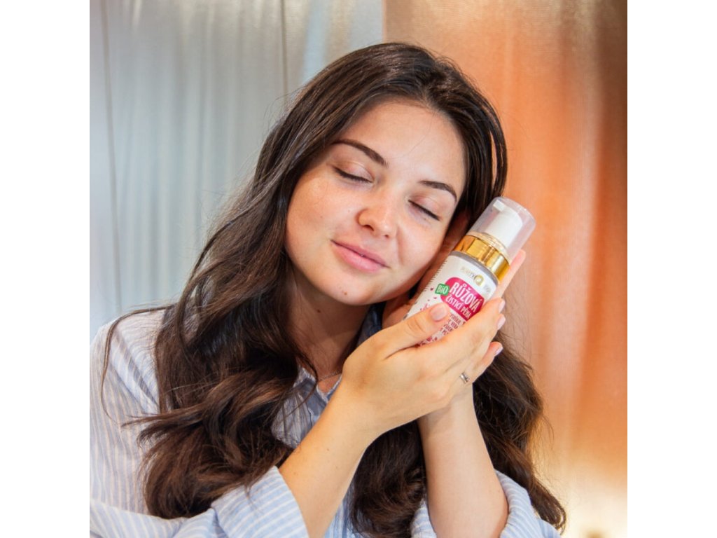 Krok č. 5 - Výživa: Naneste Bio Růžový denní krém nebo Bio Růžový pleťový olej pro intenzivní výživu a ochranu pleti, která ji zanechá hebkou a zářivou.