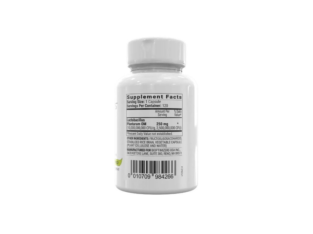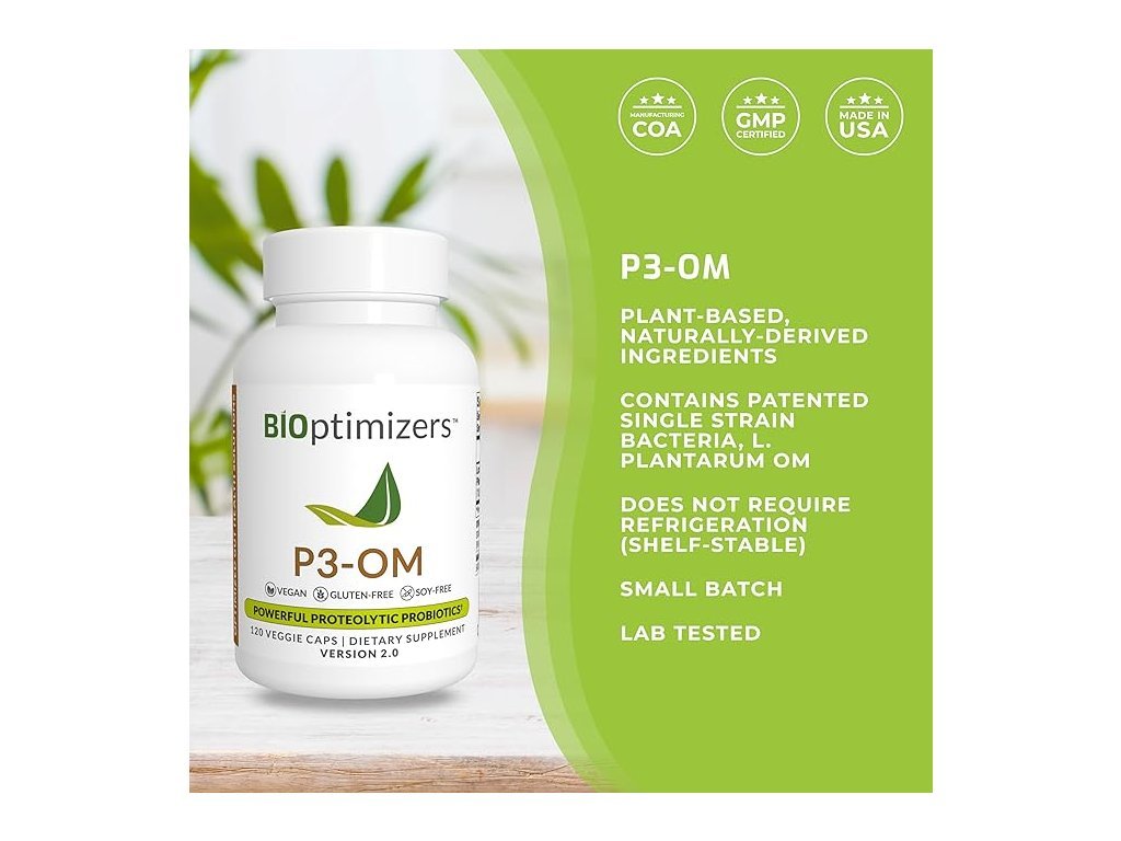 BiOptimizers P3-OM je prebiotikem a probiotikem zároveň. Obsahuje Lactobacillus plantarum s 2,5 miliardami CFU v jedné kapsli. Vyznačuje se také dlouhou trvanlivostí díky lyofilizovaným bakteriím.