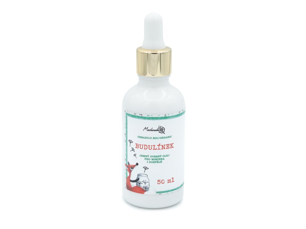 Základ tvoří jojobový za studena lisovaný olej (správně tekutý vosk), který znáte z naší unikátní Zinkové masti. Jojobový olej zvyšuje odolnost kůže a má úžasné regenerační účinky. Rýžový olej v bio kvalitě napomáhá tvorbě kolagenu, snižuje opotřebení pleti, pomáhá ji udržet v kondici. Ovesný olej je unikátní při péči o poškozenou kůži. Jde o velmi ceněný a těžko dostupný olej. Budulínek je dále obohacen o bio extrakt z ovsa, který je vysoce koncentrovanou silou této úžasné obiloviny. Bio meruňkový olej přináší kůži další benefity v podobě přírodního vitamínu E i zvýšení elasticity kůže. Je olejem číslo jedna pro dětskou a citlivou kůži. Trocha vanilkového extraktu vytváří spolu s ovsem jemnou vůni snídaňového müsli :).
