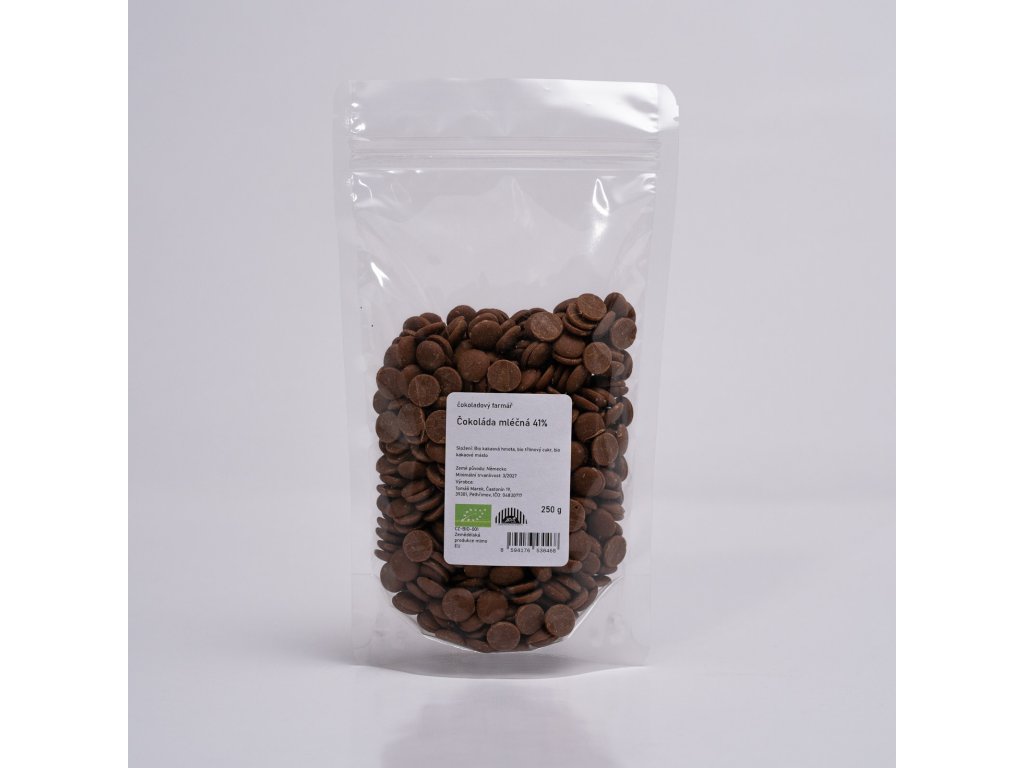 Bio mléčná čokoláda 41 % – prvotřídní kvalita, bez lecitinu, s jemnou a vyváženou chutí.