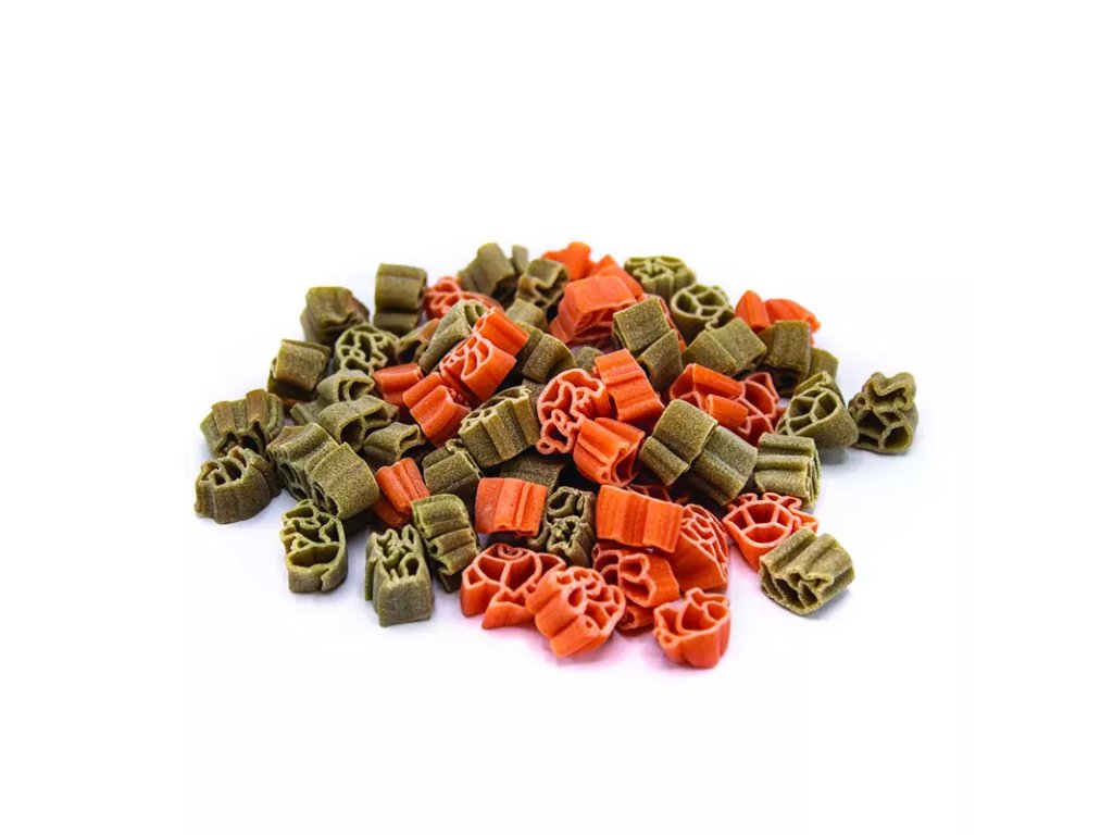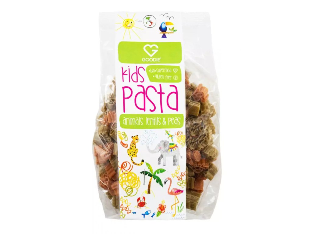 Barevné BIO těstoviny ve tvaru zvířátek jsou vyrobeny ze zeleného hrášku nebo červené čočky a celozrnné rýže. Jsou přirozeně bezlepkové, vhodné pro celiaky. Pochutnají si na nich vegani a především děti.
