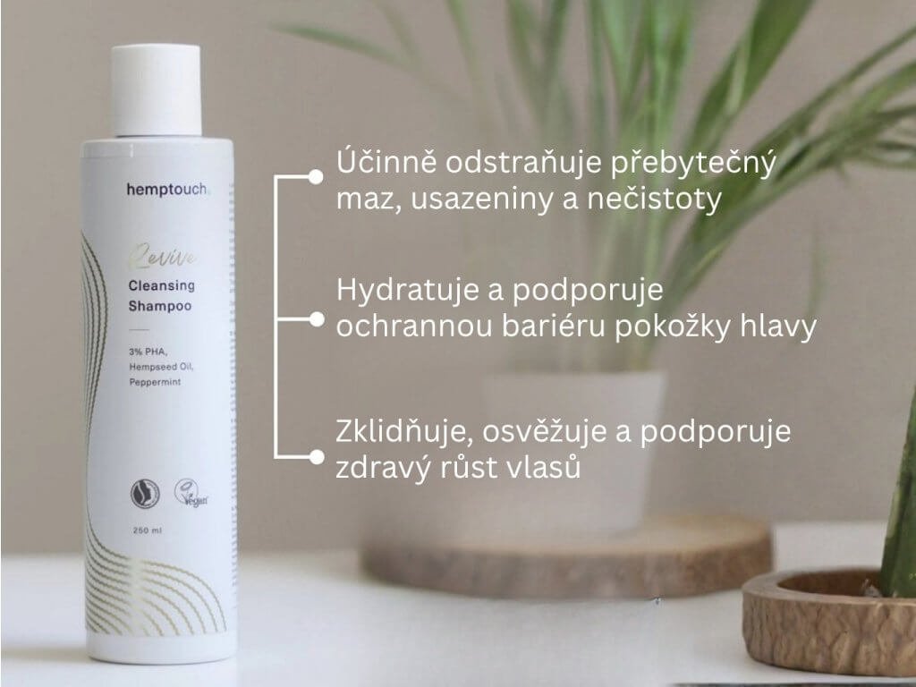 Šampon s 3% PHA kyselinou a konopím hloubkově čistí, hydratuje a zanechává vlasy lesklé, plné objemu a bez podráždění.