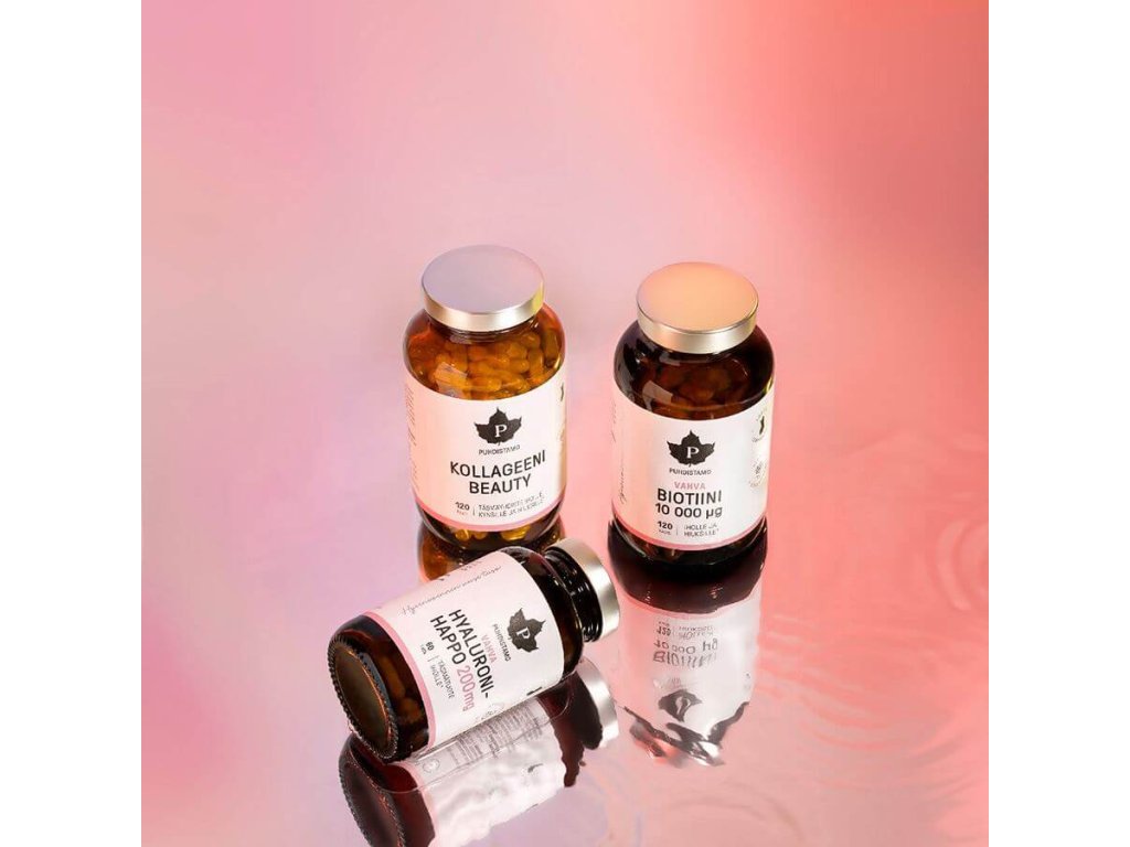Strong Hyaluronic Acid Puhdistamo obsahuje 200 mg kyseliny hyaluronové, která podporuje hydrataci pokožky. Tato kyselina je známá svou schopností vázat vlhkost a zlepšovat pružnost pokožky. Dále je obsažený vitamín C, který napomáhá tvorbě kolagenu. Kolagen je důležitou stavební složkou pokožky a podporuje její normální funkci. Vitamín C navíc pomáhá chránit buňky před oxidačním stresem. Kapsle dále obsahují extrakt z přesličky rolní, který je přirozeným zdrojem křemíku. Tento doplněk můžete používat samostatně jako součást své každodenní kosmetické rutiny – nebo jej kombinovat s dalšími produkty z řady Puhdistamo Beauty, jako jsou Strong Biotin a Beauty Collagen.