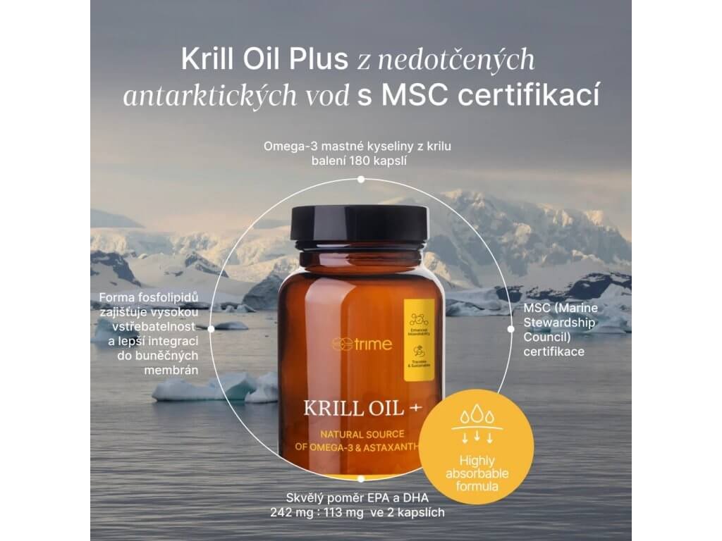 Krill Oil Plus je získaný z drobných mořských korýšů, známých jako kril, kteří žijí v čistých vodách Antarktidy. Tento olej je bohatý na omega-3 mastné kyseliny EPA (kyselina eikosapentaenová) a DHA (kyselina dokosahexaenová).