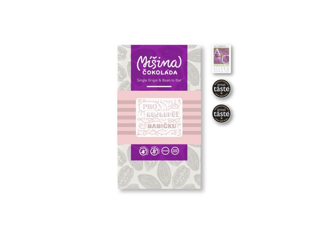 Tmavá čokoláda s věnováním pro babičku je vyrobena z výběrových bio kakaových bobů z Tanzanie a třtinového cukru. Má méně cukru, aby vynikla čistá chuť čokolády, kterou doplňují jemné tóny jablek a třešní, s máslovou texturou.