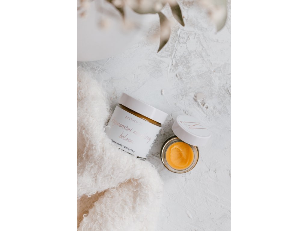 Regenerační měsíčkový balzám, který je určený k péči o citlivou a podrážděnou pokožku. Měsíčkový extrakt je úžasný lék na kožní záněty, urychluje hojení ran, pečuje o pooperační jizvy, je antiseptický a protizánětlivý.