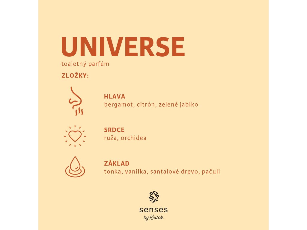 Unisex parfém Universe spojuje citrusy, zelené jablko, květiny a dřevité tóny s vanilkou v osvěžující a výjimečné vůni s vesmírnou aurou.