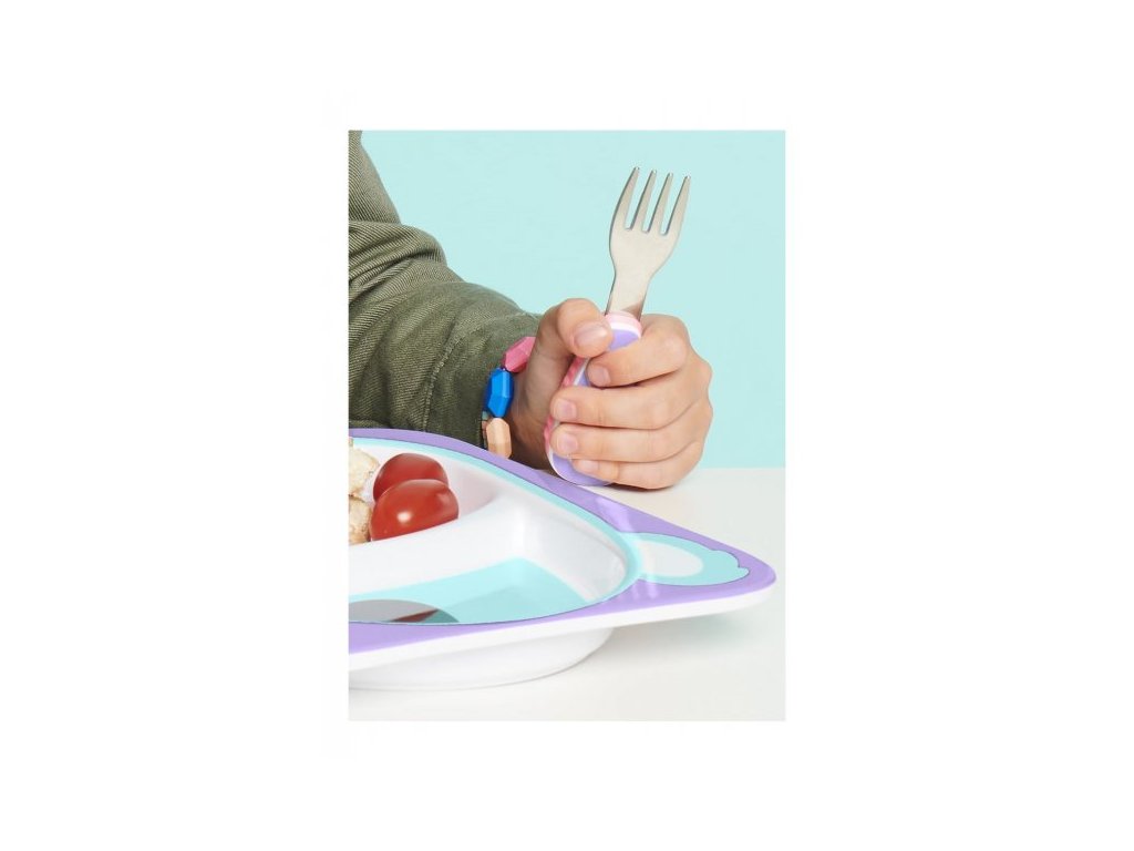 Přátelské motivy pro radost z jídla! Tento roztomilý set - vidlička a lžíce má měkké boční úchyty, takže se snadno drží i v maličkých ručičkách.