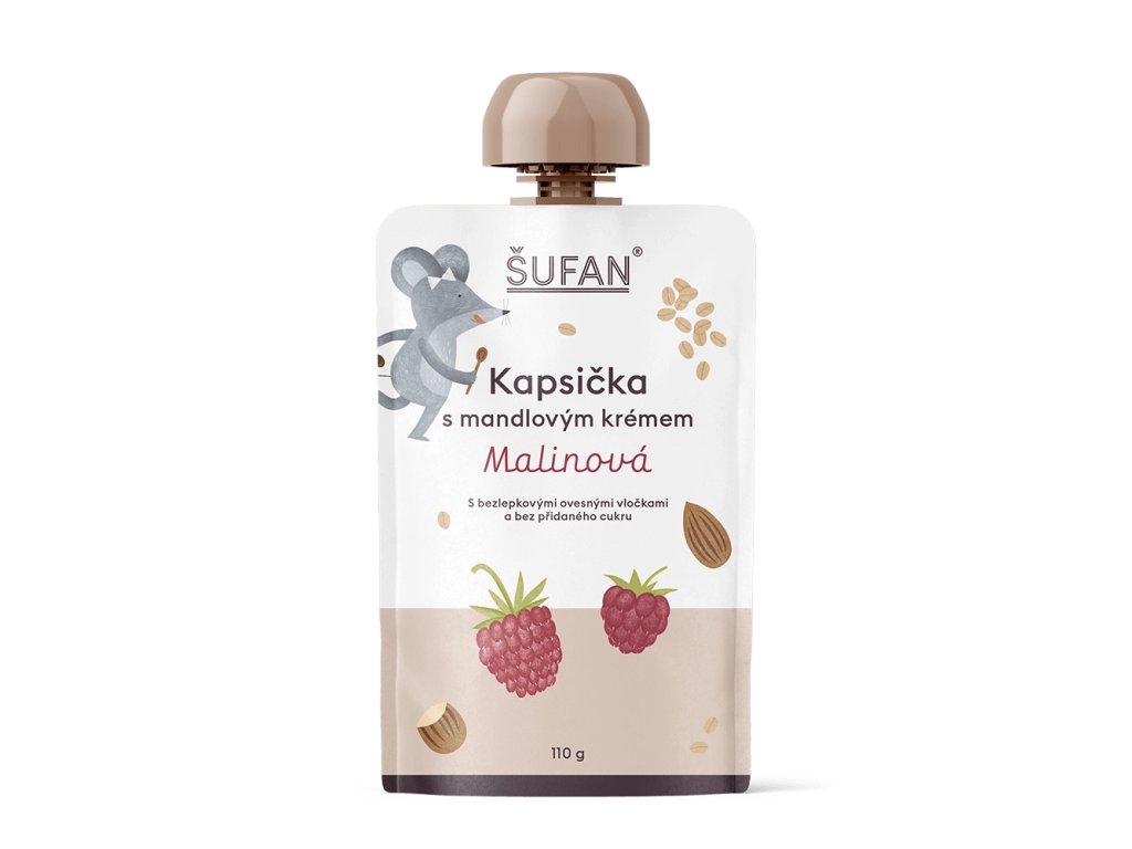 Ovocné kapsičky bývají fajn, ale často z nich děti dostanou jen rychlou dávku cukru. Proto vznikla ŠUFAN kapsička s mandlovým krémem a malinami. Šťavnatá, přirozeně sladká a obohacená o to nejlepší z bezlepkových ovesných vloček i ořechů.