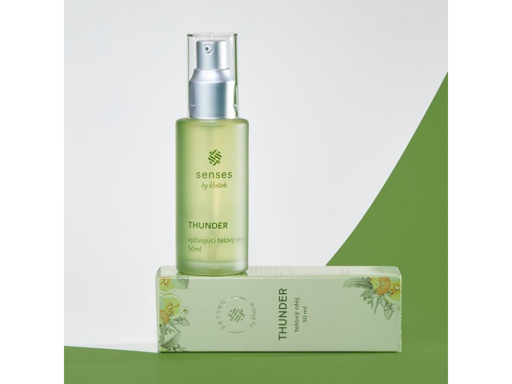 Unisex vůně Thunder v tělovém oleji s tóny spearmintu, pepře a santalového dřeva vyživuje pokožku a obnovuje její hebkost, pružnost a hydrataci.